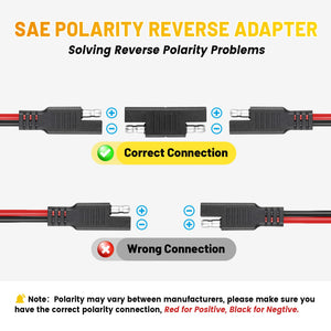 - 【SAE to SAE Polarity Reversal Adapter】: SAE outlet polarity of different brand solar panel chargers might be different, a SAE polarity connector is included to allow easily change the cable polarity to suit your needs; Please make sure red to red, black to black for correct polarity wire connection
