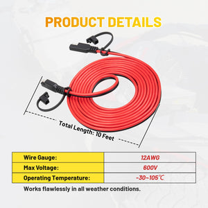 - 【Universal SAE to SAE Extension Cable】: 10FT battery charger cable, Red wire is for positive and black wire for negative,constructed with 12AWG thick pure copper wires for excellent electrical conductivity, withstand high currents, ensuring safe and long-lasting performance